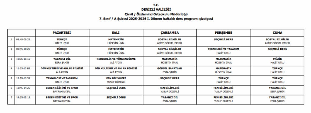 7/A SINIFI HAFTALIK DERS PROGRAMI