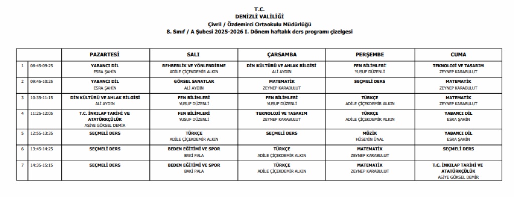 8/A SINIFI HAFTALIK DERS PROGRAMI